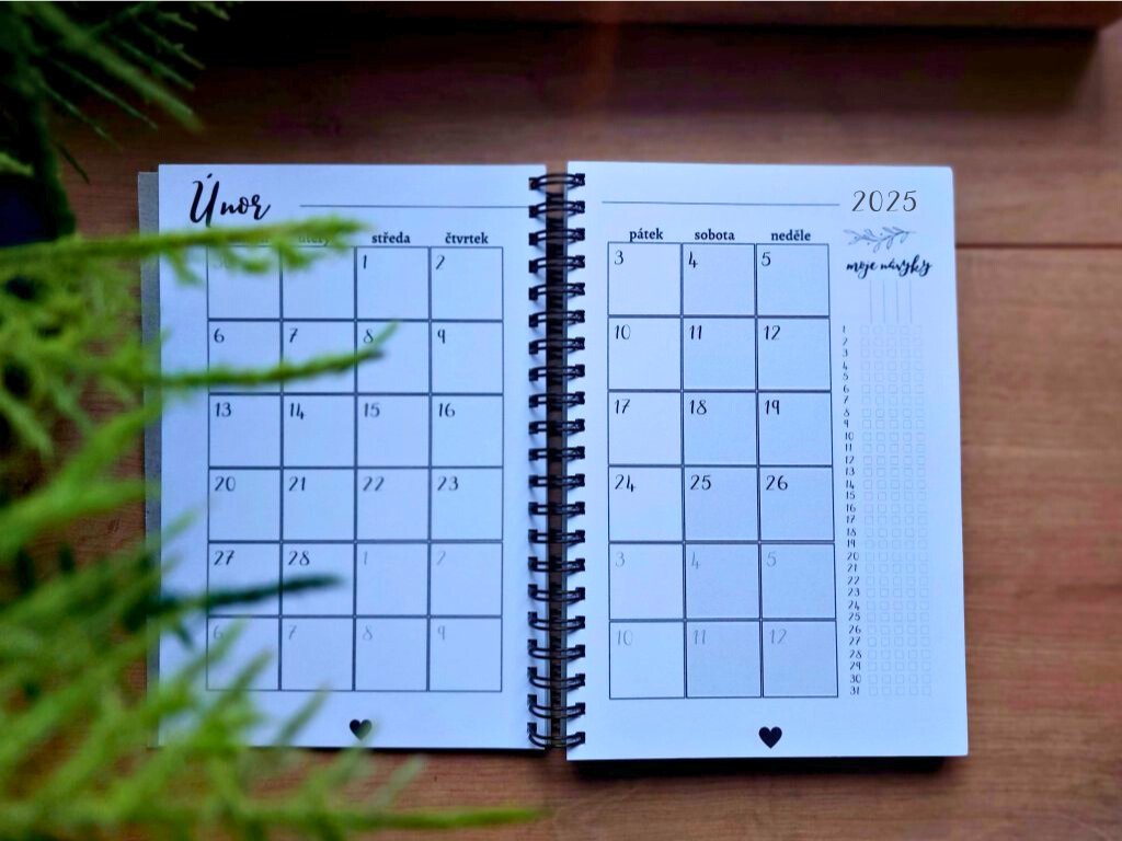 Na levé straně najdete přehled dnů v týdnu, kam si snadno zapíšete všechny důležité věci. Pravá strana je volná a já věřím, že si ji užijete přesně podle svého – ať už na poznámky, nápady, nebo třeba kresbičky. Na začátku diáře najdete každý měsíc v tabulce pro přehledné plánování a také sledovač návyků, který vám pomůže posouvat se dál.