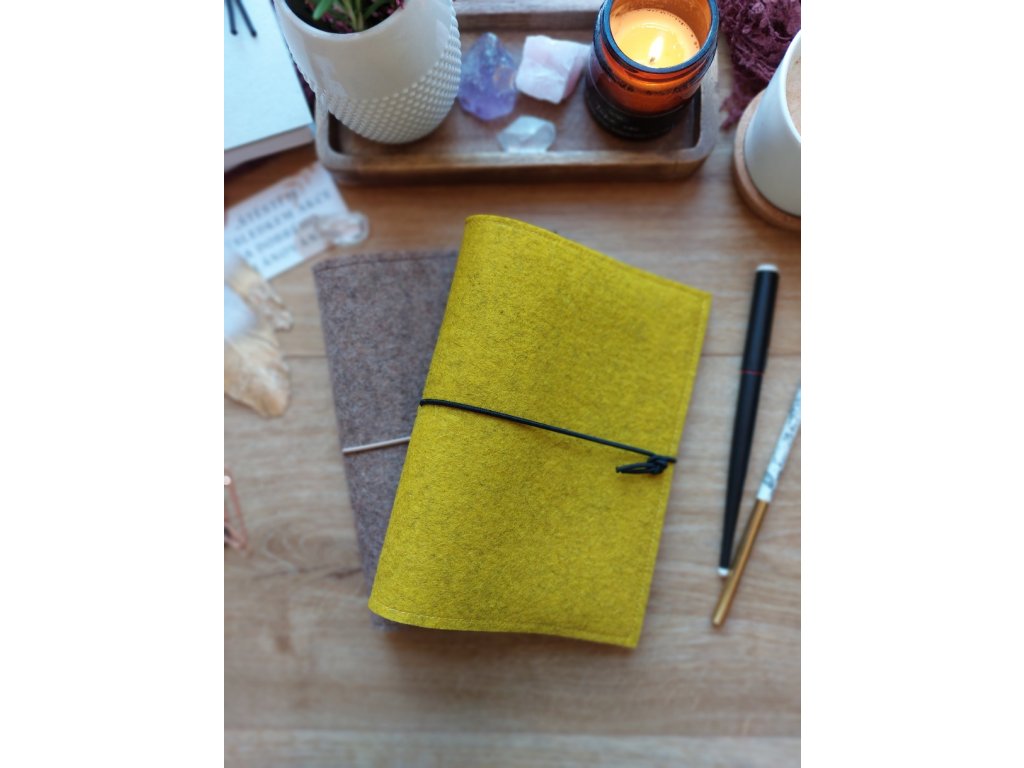 Obal vznikl spojením kvalitní plsti a pratelného papíru. Je doplněn gumičkou, která brání nechtěnému otevření a také je možné za ni zasunout tužku a mít ji při ruce vždy, když ji potřebujete. Standardně je dodáván s černou gumičkou. Pokud budete mít zájem o jinou barvu gumičky, viz vzorník, napište tuto informaci do poznámky k objednávce.